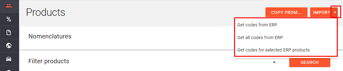 Acesta contine butoanele Copy from... si Import (cu optiunile Get codes from ERP, Get all codes from ERP si Get codes for selected ERP products) in partea de sus a paginii, sectiunile colapsabile (ce se pot micsora/mari) cu Nomenclatoare si criterii filtrare, precum si grid-ul Product Commodities in care se incarca rezultate in urma actionarii butonului Search.