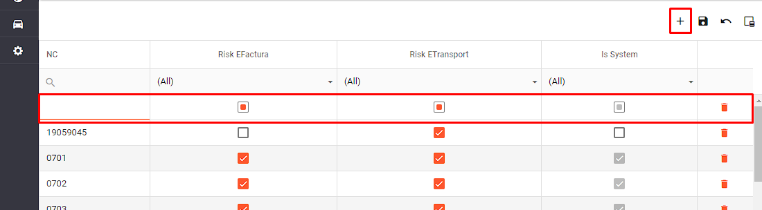 Pentru a adauga un cod NC cu grad de risc in grid se apasa butonul +. In grid este afisat un nou rand, unde se poate introduce manual codul, si se pot bifa/debifa optiunile de pe coloanele Risk EFactura si Risk ETransport (implicit cele doua coloane au valoarea Screenshot 1.png indiferent). Coloana Is System nu este editabila; iar la adaugarea de rand nou in grid, aceasta ramane debifata.